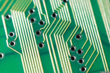 Close-up view of printed circuit board with gold-plated traces and via holes for electronic component connections