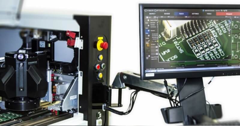 Automated PCB inspection machine analyzing circuit board for soldering defects and alignment accuracy