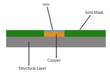 Cross-sectional diagram of PCB showing HASL finish, copper layer, solder mask, and structural base