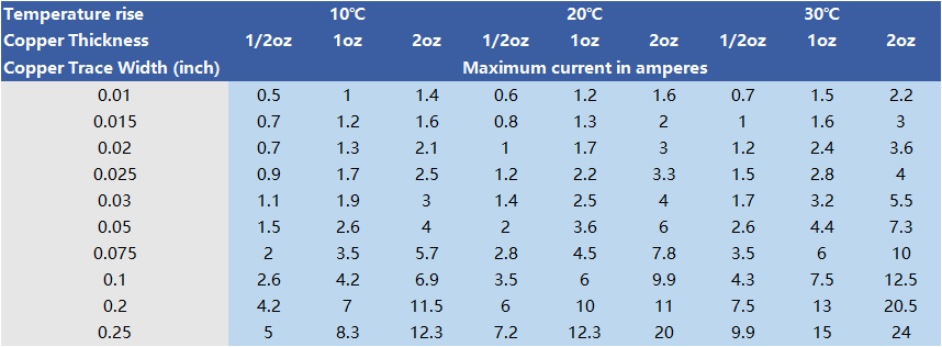 A PCB trace width table can help you determine the width of the PCB traces while also giving insights into the current-carrying capacity and the effect of temperature rise. You can refer to the table below: