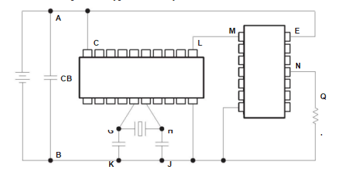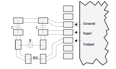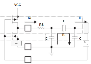 The crystal-oscillator circuit needs to be analyzed with respect to the flow of significant currents to determine where interference suppression is necessary. A parallel resonant circuit is formed by the delta section, consisting of the crystal (X) and the two capacitors (C). The crystal behaves like an inductance, with the resonant frequency being somewhat above the actual resonant frequency of the crystal. The impedance of the delta section, measured at the input or output, typically amounts to several tens of kilohms because of the high Q of the crystal. When components are correctly dimensioned, a very small current (IO) flows between the amplifier and the external components because of the high resistance of the circuit.