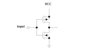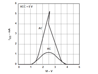 However, if a voltage between the two limits (VIT and VCC – VIT ) is applied to the input of this inverter, both transistors will be more or less conducting. The result with this configuration is a considerable increase in the supply current (see Figure 3). In such a case, HCMOS circuits take a current of up to about 1 mA, whereas, with advanced CMOS (AC), the supply current can increase to over 5 mA.