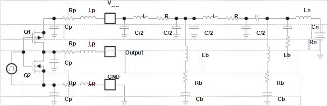 To achieve a significant improvement, it is first necessary to analyze the complete circuit and its parasitic components. Figure 4 shows the circuit under examination. Two transistors (Q1 and Q2) are the output stage of an IC whose behavior is to be analyzed. Connection to the surrounding circuitry is made with the Lp/Rp/Cp network, which represents the parasitic components of the package. The following individual values are assumed: