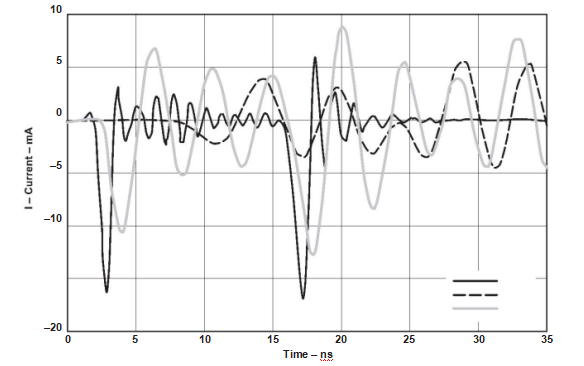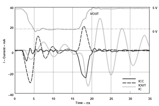 Because the input voltage at such a circuit cannot traverse the critical voltage region when changing from a low to a high (or vice versa) in an infinitely short time, there is flow during this time of pulse-shaped current peaks (often known as current spikes), of such magnitude that cannot be neglected. In an input stage, current amplitudes of 1 mA to 5 mA must be expected (see Figure 3). Considerably more critical is this phenomenon at the outputs of an IC. Since the output stages must drive the load that is connected to the output, these transistors must be made considerably bigger. As a result, the amplitudes of the current peaks also increase correspondingly to values of from 20 mA for HCMOS devices to 60 mA for AC devices, with a pulse width of 5 ns to 10 ns.