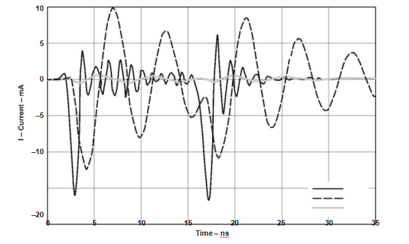 The results of the simulation are shown in Figure 6. As might be expected, the currents in the leads to the IC ICC and in the first CB (IC1) have not become any smaller. However, Figure 6 shows that there is a reduction of the current amplitude (ICH) by more than 20 dB after the inductor. This method can contribute to a significant reduction of the radiation.