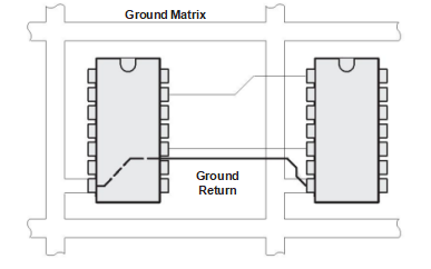 Care should be taken to make the antennas as ineffective as possible, i.e., make the areas enclosed by the outward and return lines as small as possible. An effective method is to run the return line parallel to the signal line (see Figure 10). (This is automatically ensured with multilayer circuit boards that have a continuous ground level under the signal lines.) If signals with high frequencies (such as clock signals) are transmitted or lines are very long, this method will often be used. In this case, lines having defined line impedances (be cautious of reflections) as a result will also be provided. With an appropriate layout of the additional ground lines, crosstalk between critical lines can be reduced.