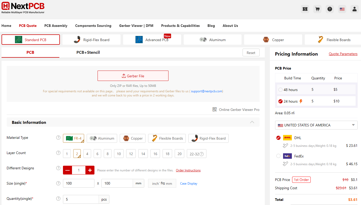 NextPCB offers a 24/7 online quoting system that allows for transparent pricing. You just need to upload your Gerber files and check the required parameters, and the system will immediately provide a quote, giving you clear insight into the costs.
