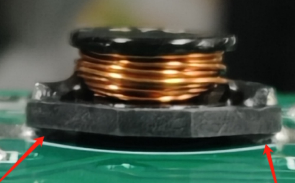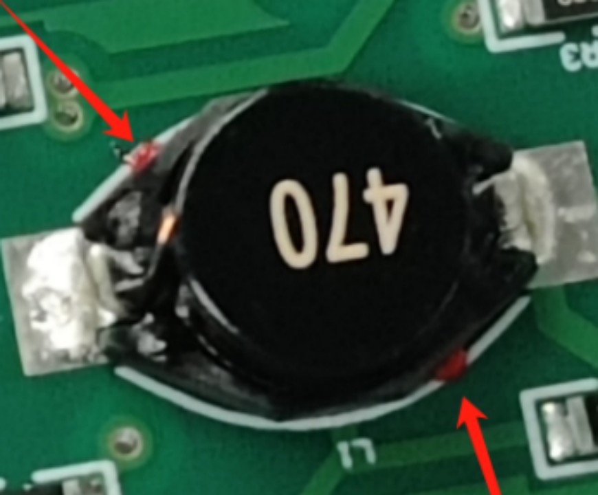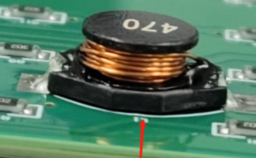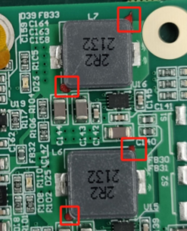 Red glue is applied to the sides of these components, as shown in the pictures below. With red glue, during the second reflow, the components are pre-fixed and will not fall off or shift due to the re-melting of the solder paste.