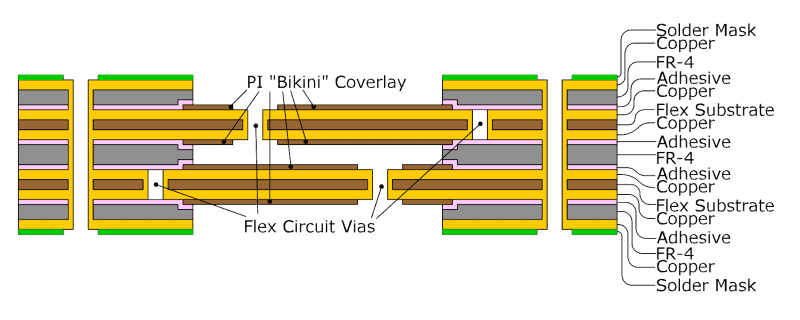 Typically, a rigid-flex stack-up comprises at least one flexible layer pair positioned between rigid sections. For instance, double-sided flexible PCBs laminated with rigid sections and layers of pre-preg are the most commonly designed rigid-flex boards, as illustrated in the figure above.
