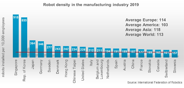 According to this report, the average robot density in the global manufacturing industry is 113 units per 10,000 employees. In terms of regions, Western Europe (225 units) and Northern Europe (204 units) have the highest degree of automated production, followed by North America (153 units). ) And Southeast Asia (119 units). The top ten countries/regions in terms of automation are as follows: 1. Singapore, 2. South Korea, 3. Japan, 4. Germany, 5. Sweden, 6. Denmark, 7. Hong Kong, 8. Chinese Taipei, 9. The United States, 10. Belgium/Luxembourg.