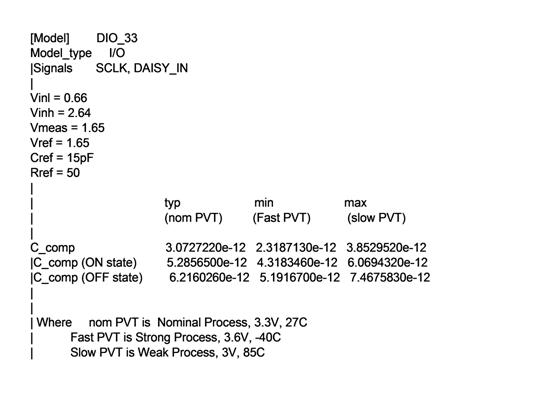 The second important capacitor value is the C_comp value below the [Model] keyword. Just as you find the correct model in the IBIS model, you will also find a list of C_comp values. Figure 3 shows an example of C_comp in the DIO_33 model.