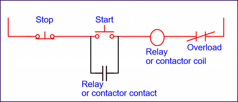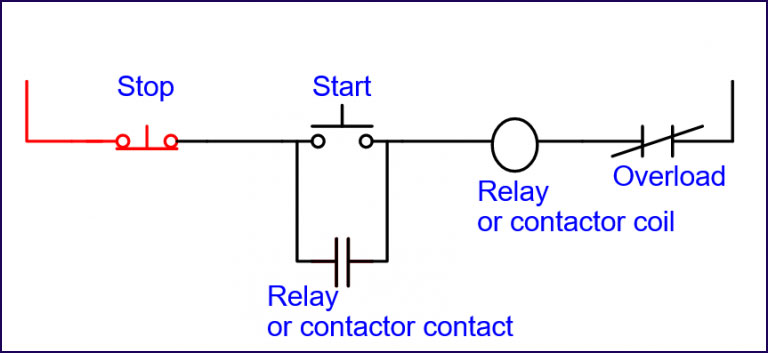 When you press the start button, current flows through the push button and seal-in contact. The contact then manages coil power distribution. As a result, you can depress the start button without disrupting the current flow. When you press the start button, current flows through the push button switch and the seal-in contact. The contact then manages coil power distribution. As a result, you can depress the push button switch without disrupting the current flow. Various methods are possible to use to de-energize the motor's coil. When the motor overloads, the contacts open. Pressing the stop button prevents power from reaching the seal-in contact, resulting in a de-energized coil.