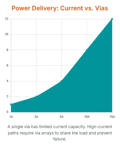 Vias are necessary for connecting power rails and ground planes (e.g., near decoupling capacitors) to provide a low-inductance, low-resistance path. In Power Integrity (PI) design, the current-carrying capacity of vias is a critical parameter.