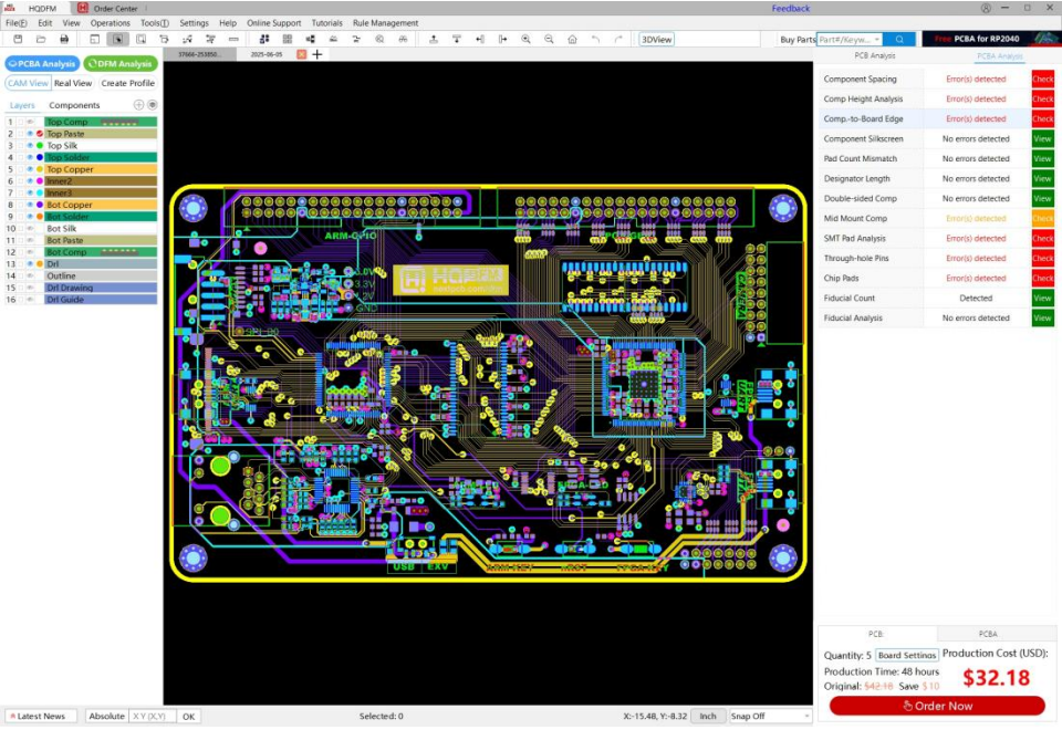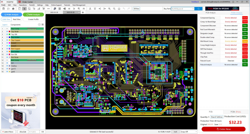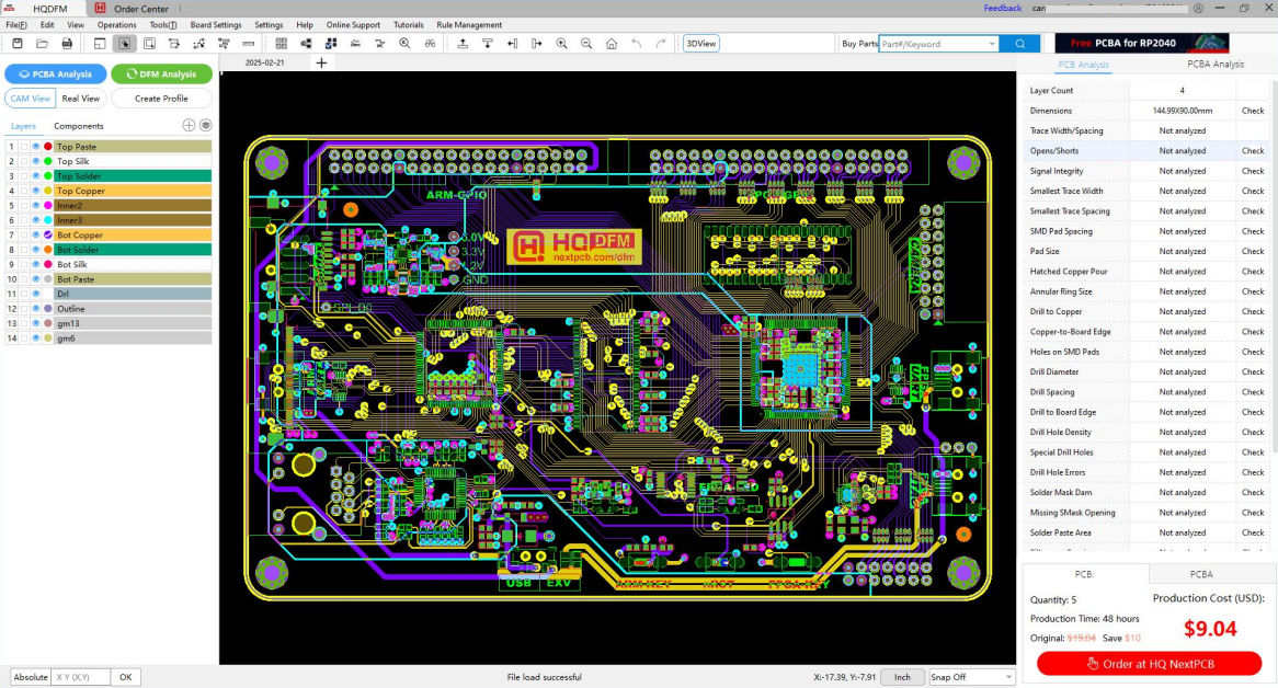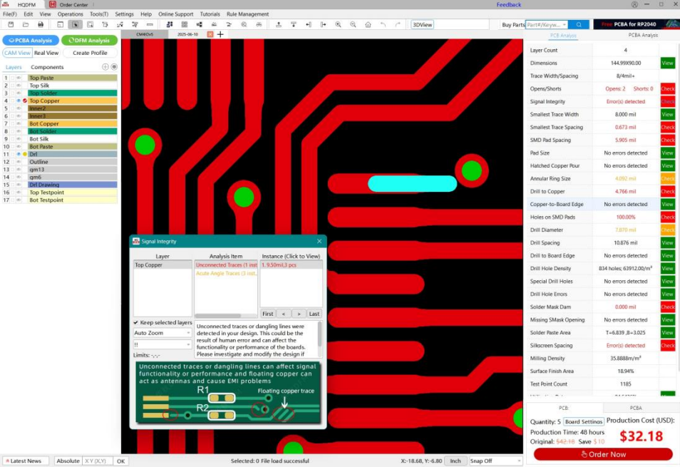 HQDFM is a free PCB DFM analysis tool developed by NextPCB for viewing PCB manufacturing files and performing quick DFM and DFA analysis. Covering over 150 design for manufacture and assembly issues, HQDFM provides actionable insights to help users enhance reliability, reduce costs and streamline production