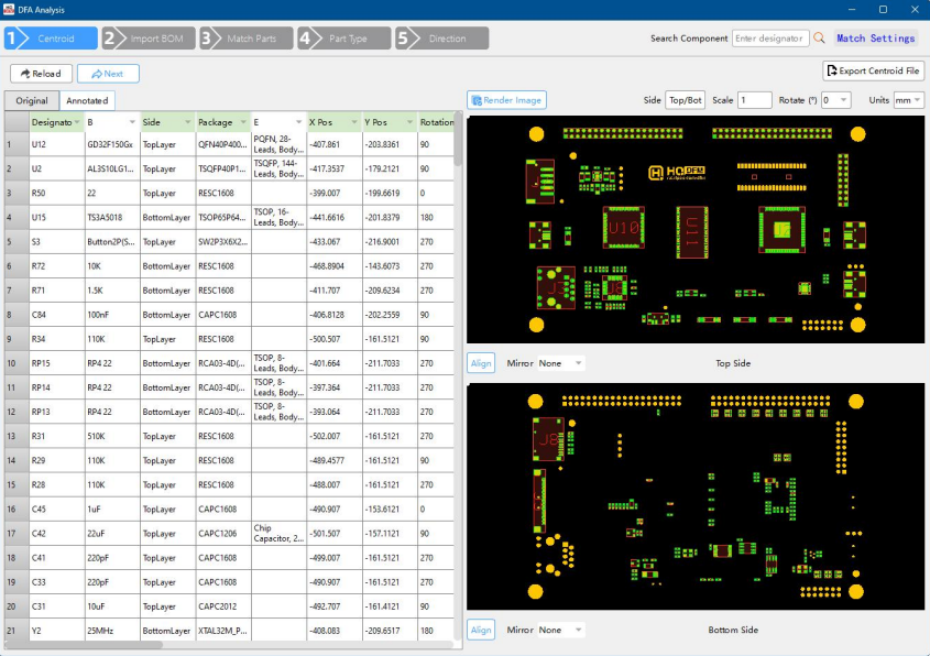 Reverse engineer PCBs i.e. Gerber to PCB file. HQDFM can only utilize the data provided. It cannot generate schematic information, ECAD design files, missing layers or auto-create Centroid (pick-and-place) data etc. Tools in HQDFM can be used to manually build centroid files, modify and export modified Gerber files and find connections using the netlist. However, these features require specialized PCB engineering knowledge and should be used with care to avoid errors.