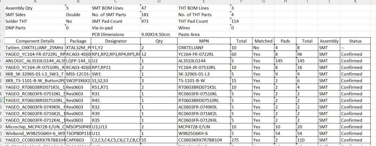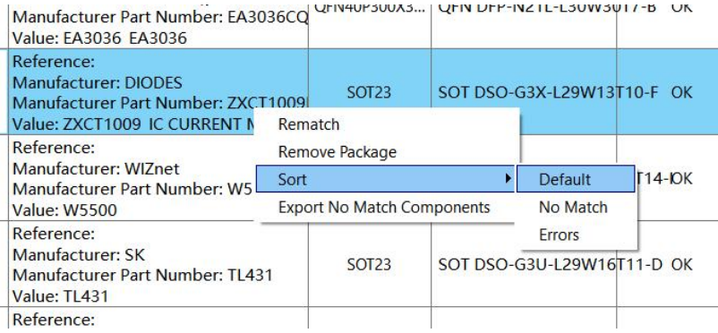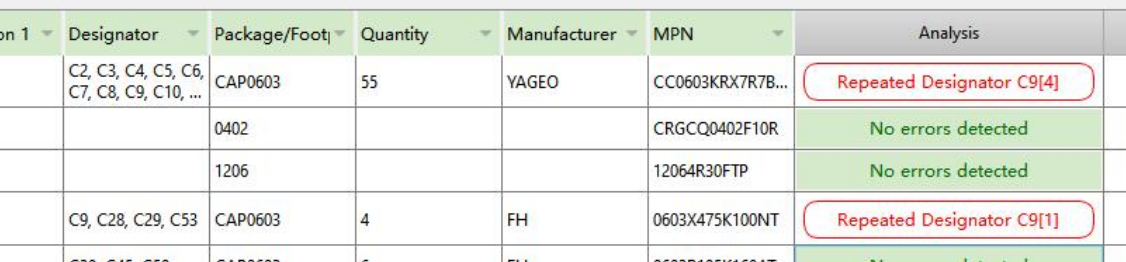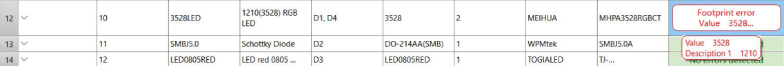f) Details box: Error messages will be shown here such as duplicate designators, mismatching quantities etc.