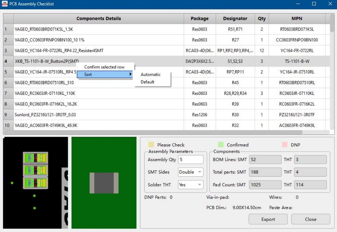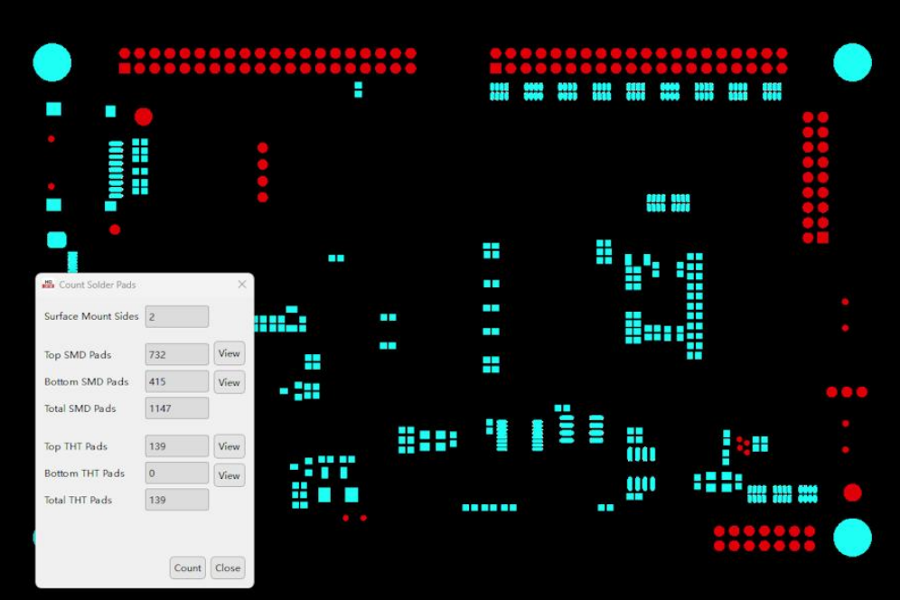 Click the Count button to automatically count all the pads. The View buttons on the side can be used to view and verify the pads which have been included in the calculation. Note that these pads are counted purely based on their layer properties and not whether they are included in the BOM or not.