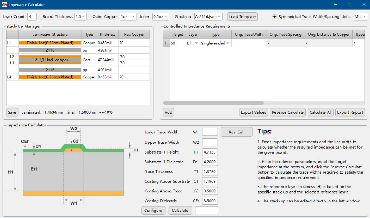 Impedance Calculator: Quickly calculate controlled impedance for multiple traces simultaneously using parameters such as trace geometry, material properties and layer stackup. HQDFM’s impedance calculator supports various trace types (single-ended, differential, co-planar) and transmission line structures including Microstrip, Embedded Microstrip, Stripline and Dual Stripline<>.
