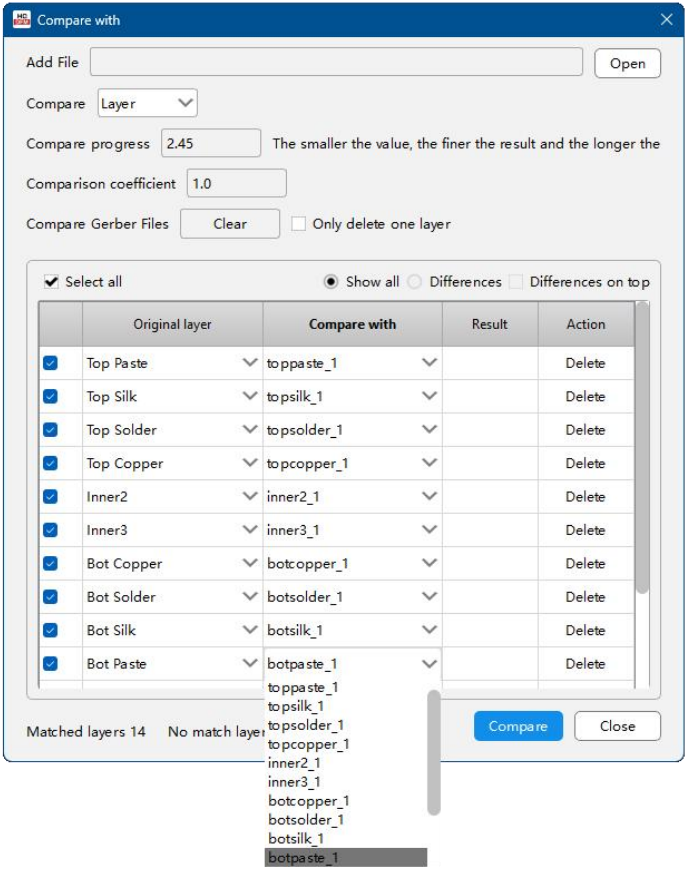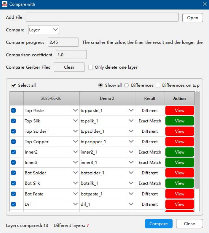 5. Select/deselect the layers as required and click [Compare] to perform comparison. Processing will take longer for larger files and more layers. Deselect some layers to speed up comparison.