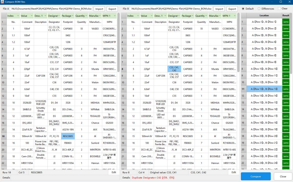 The Compare BOM Files tool can be used to find individual differences between BOM file versions with a convenient side-by-side view.