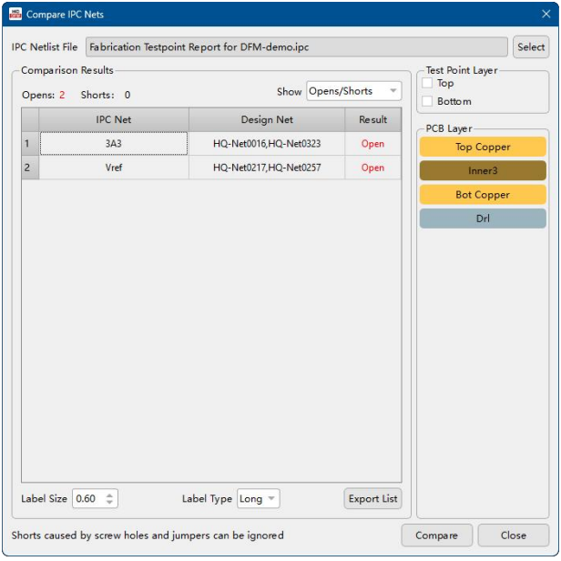 Mistakes in the design file or export procedure may cause errors to appear in the production files that are not detectable in the EDA software. By using the Compare IPC Nets tool, shorts and opens can be identified by using IPC netlist files.