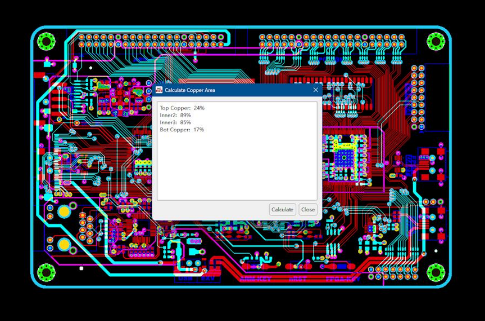 Calculate the percentage copper coverage in circuit layers. Simply click calculate and the tool will calculate the copper area as a percentage of the total board area. This can be useful for gaining insights into the copper distribution between layers.