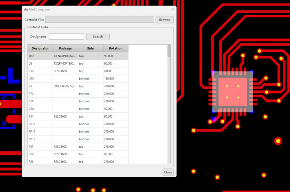 Quickly find the location of any part on the board by importing the centroid file and specifying it's designator. You can also click the part in the list directly. If you have already imported the centroid file in the PCBA Analysis wizard then there is no need to import it again.