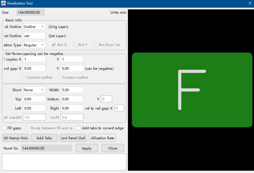 f) Select from preset breakaway rail configurations such as Left & Right, Top & Bottom, Four sides or custom values. Each width can be set individually or together by first changing the Width field then selecting the preset configuration.