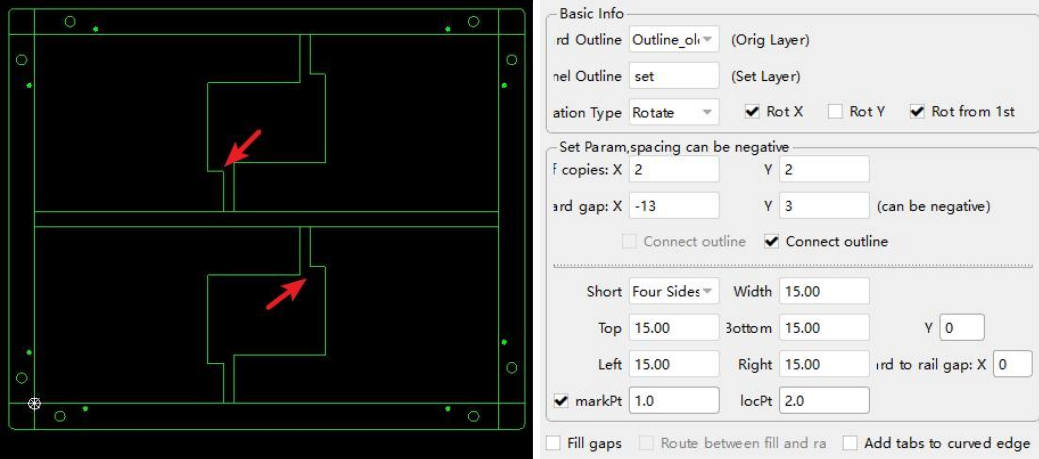 The panelization tool can be used to create panelized Gerber data with v-cuts, tabs, stamp holes, fiducial marks and breakaway rails quickly.