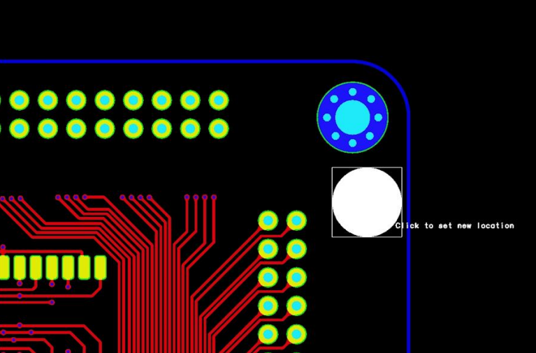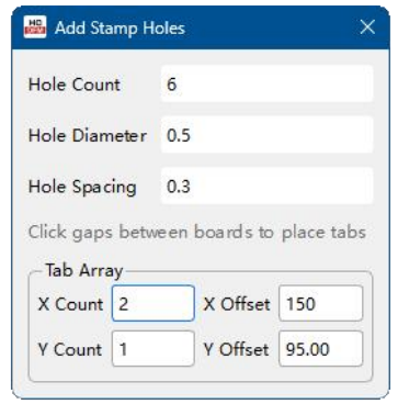 Add Stamp Holes: Use the stamp hole tool to add tabs between boards lined with stamp holes. The number of holes, spacing and size can all be modified. Move the mouse to the spacing between boards. The outline of a tab with stamp holes will appear if tabs can be added in the area. Click to add the tab.