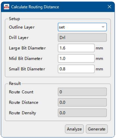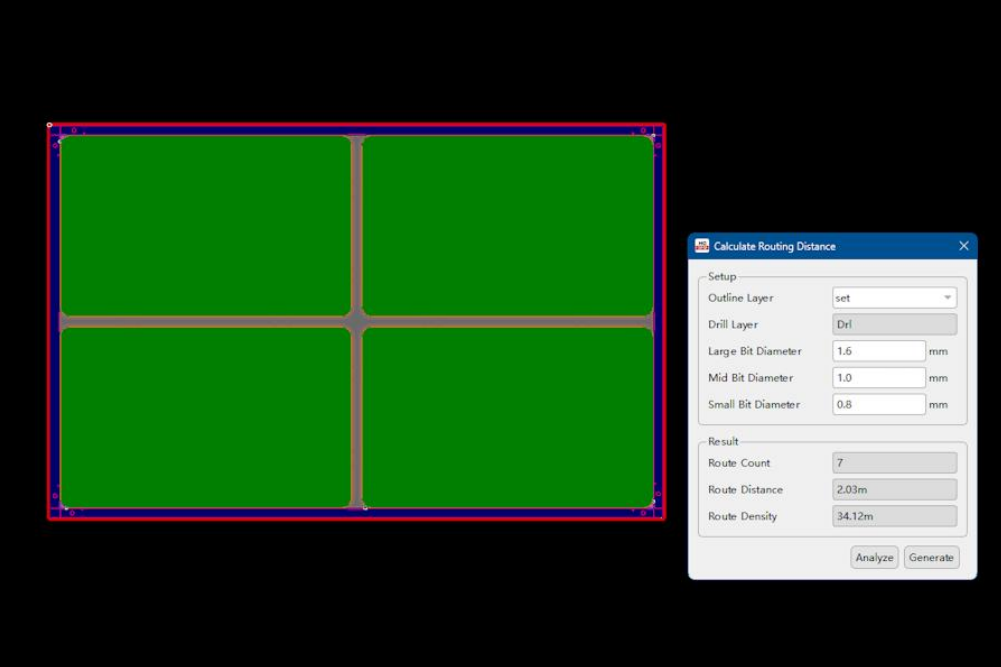 Select the outline and drill layer and the calculator will automatically select the appropriate routing tool size based on the width of the slots. To calculate the routing distance, first click the Analyze button to create the data layer which identifies breakaway rails from boards area. Click Generate to create the rou layer which contains route paths.