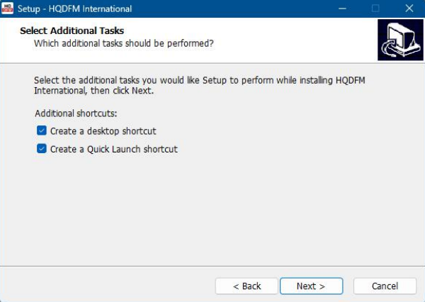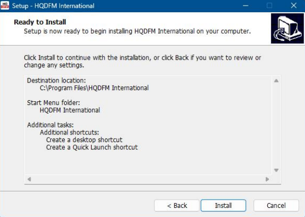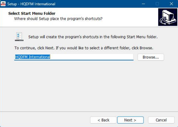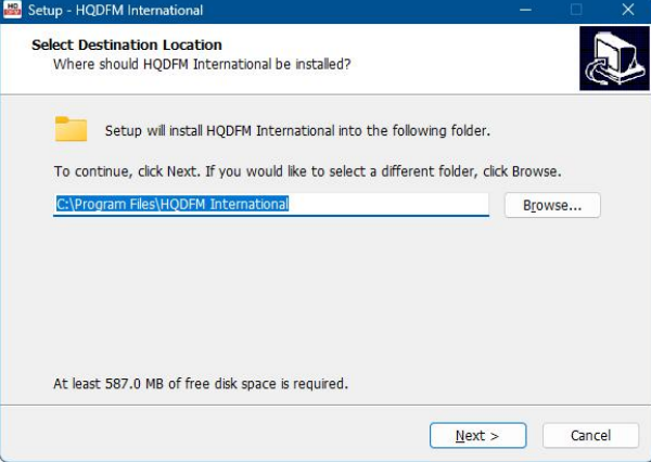 3. The default installation path is C:\Program Files\HQDFM International which can be changed. Click [Next].