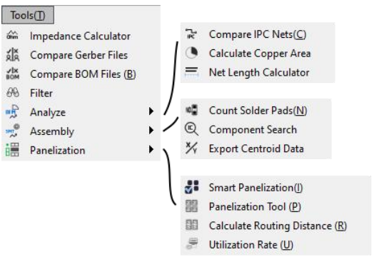 And many more tools including Utilization Rate Calculator, Solder Pad Count, Routing Distance, Component Search, Net Length Calculator, Copper Area Calculator.