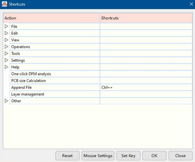 | Menu | Name | Menu Shortcut | Shortcut | Notes |