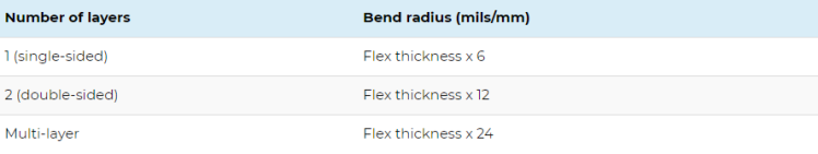 Copper and layer count limitations: The number, thickness and layout of copper layers can have a significant impact on the bend radius and bend frequency. As such, this limits the complexity and current carrying capacity of flex circuits. Design techniques such as using hatched over filled copper pour, removing coverlay in bend areas and using lower copper thicknesses can be used to increase flexiblility in bend areas.